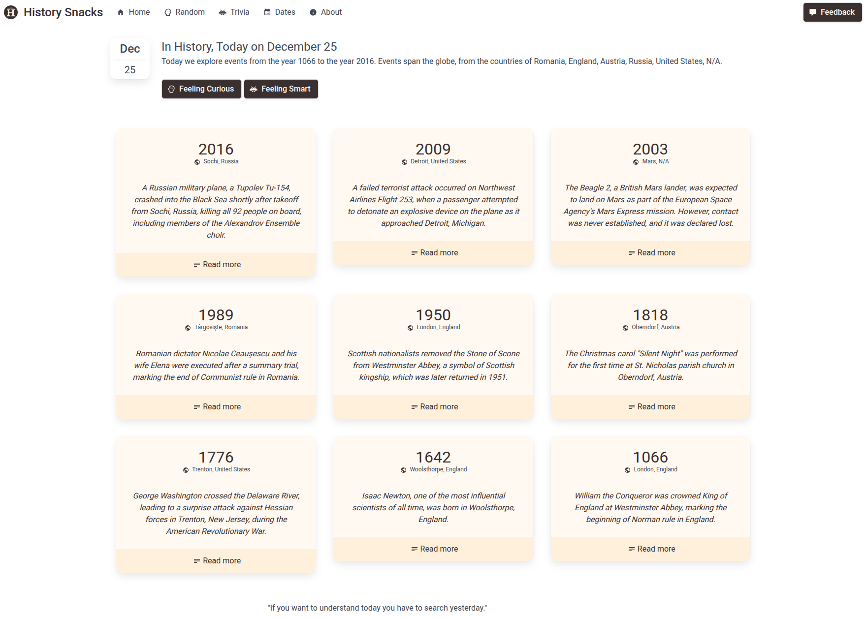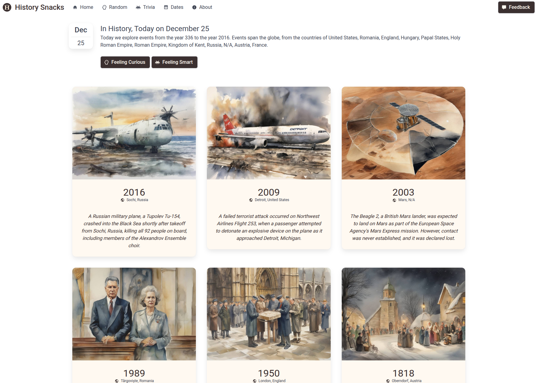 History Snacks has always been about small, self-contained moments in history. Each event is meant to stand on its own: brief, readable, and complete without demanding attention. Adding images risked undermining that. Images can easily dominate, dramatize, or mislead.