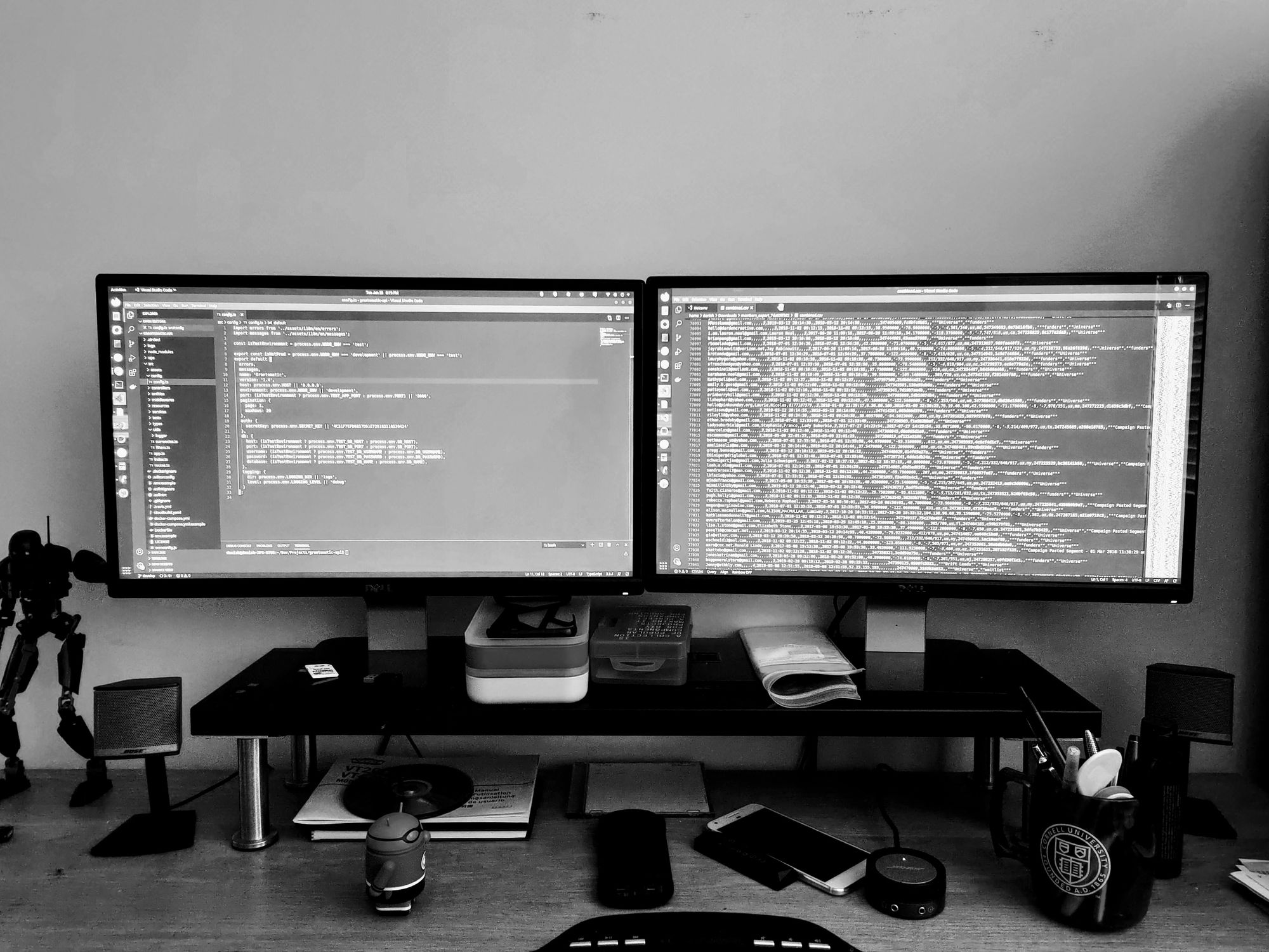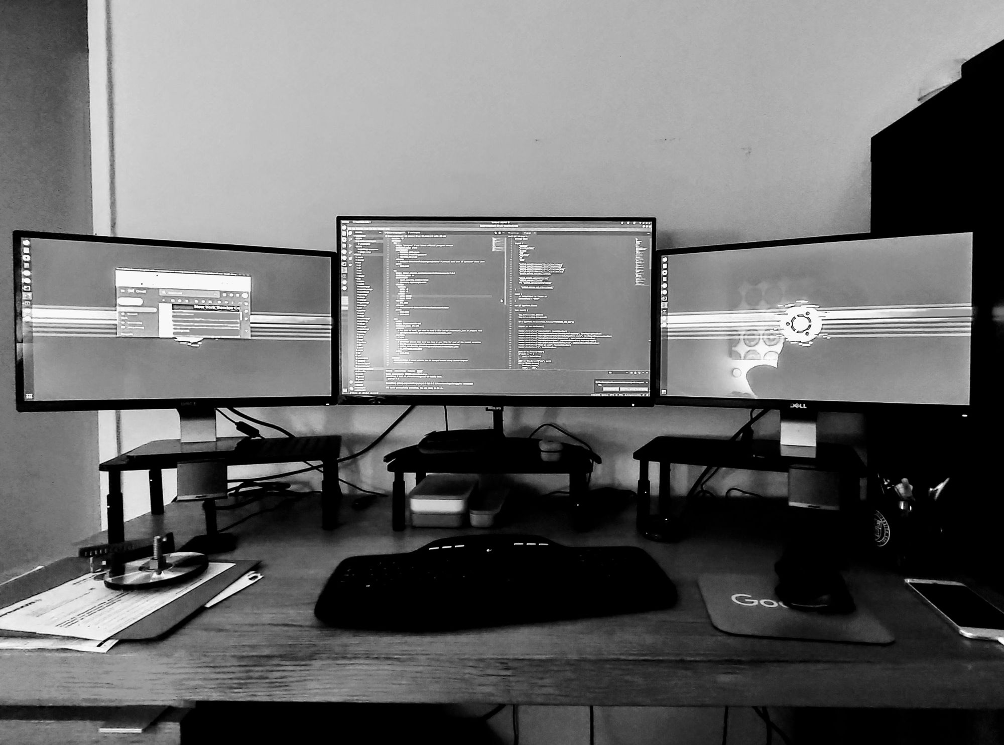 With the 2 monitor setup, I kind of felt obliged to always have 2 full screen windows open all the time. With 3 monitors, I got to be a little creative. I kept my primary focus in the middle and then various other stuff like Spotify, Slack, WhatsApp etc. on the sides and maybe have another browser window open.