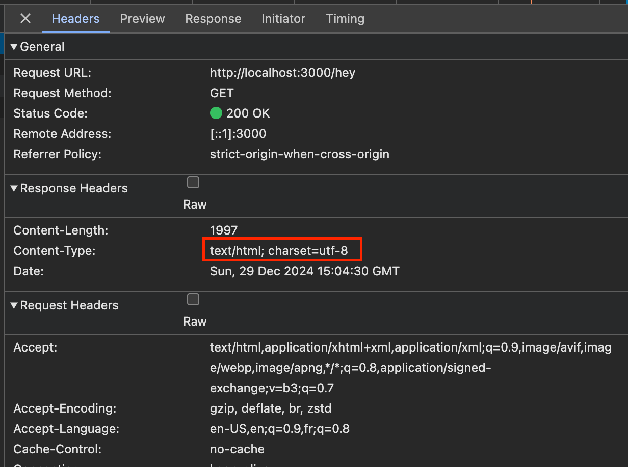 If you look closely in the Developer Tool's Network tab and inspect the response from /hey, you will see two things.