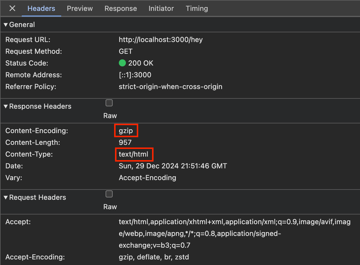 If you spin this code up on your machine and use Developer Tools in your browser, you will notice that all compressible content under /static/* is successfully gzipped, but the response from /hey is not.